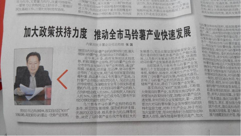 張國表示,民豐薯業(yè)將堅定貫徹總書記講話精神,落實(shí)自治區(qū)“8337”發(fā)展戰(zhàn)略,充分發(fā)揮龍頭企業(yè)帶動、幫扶作用,為推動我市馬鈴薯產(chǎn)業(yè)快速發(fā)展做出新貢獻(xiàn)。